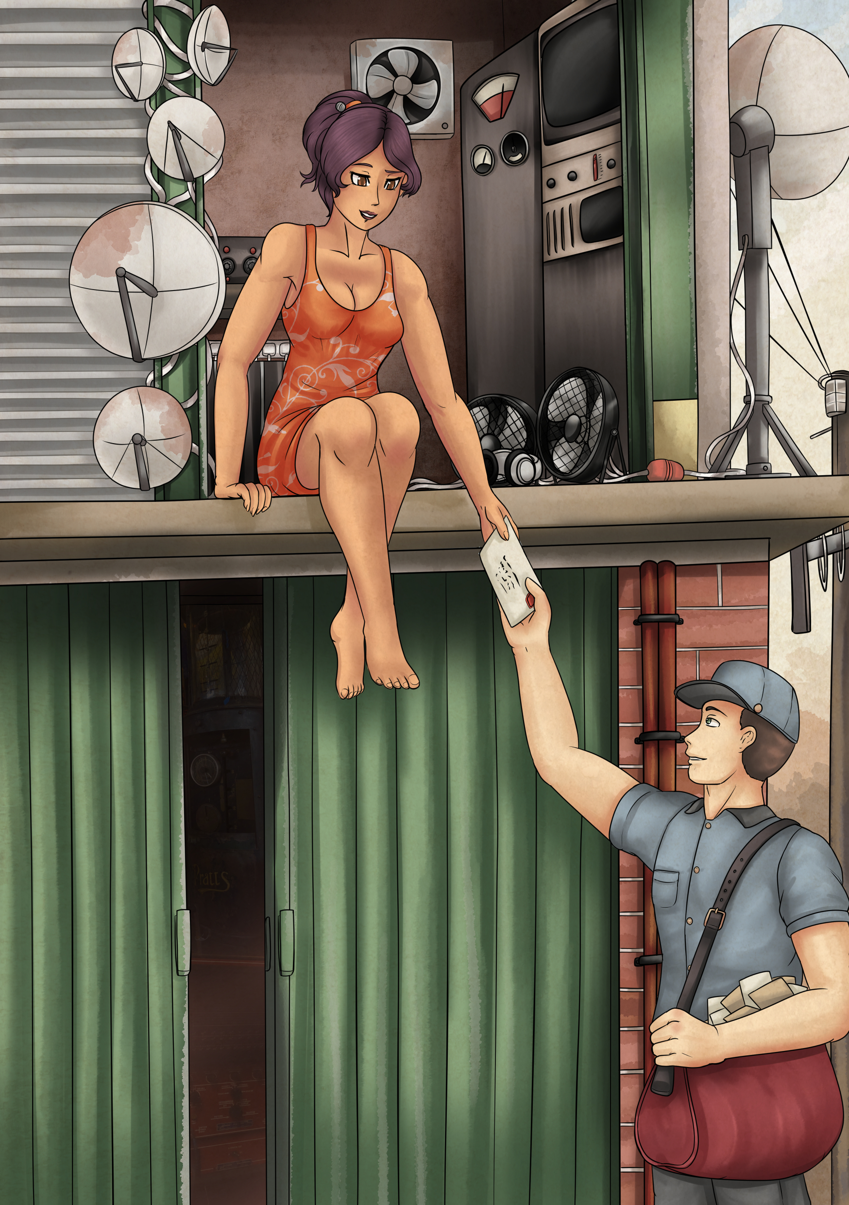 2022 – Manga Jiman Poster: As 1st place winner of the 2021 Manga Jiman competition I was given the job of producing an illustration to advertise the 2022 competition and it’s theme of Connect. I approached this piece in the same way as I would with a manga for a competition, having an image that tells a story both with the characters and the background. Set possibly in an alternative future, a woman works alone in a tower full of communication technology; probably one of many scattered around the country. This technology keeps people connected, but her source of human contact is the local postman, delivering her mail during one of her breaks. This brought together many of the themes I explored in previous Jiman works too.